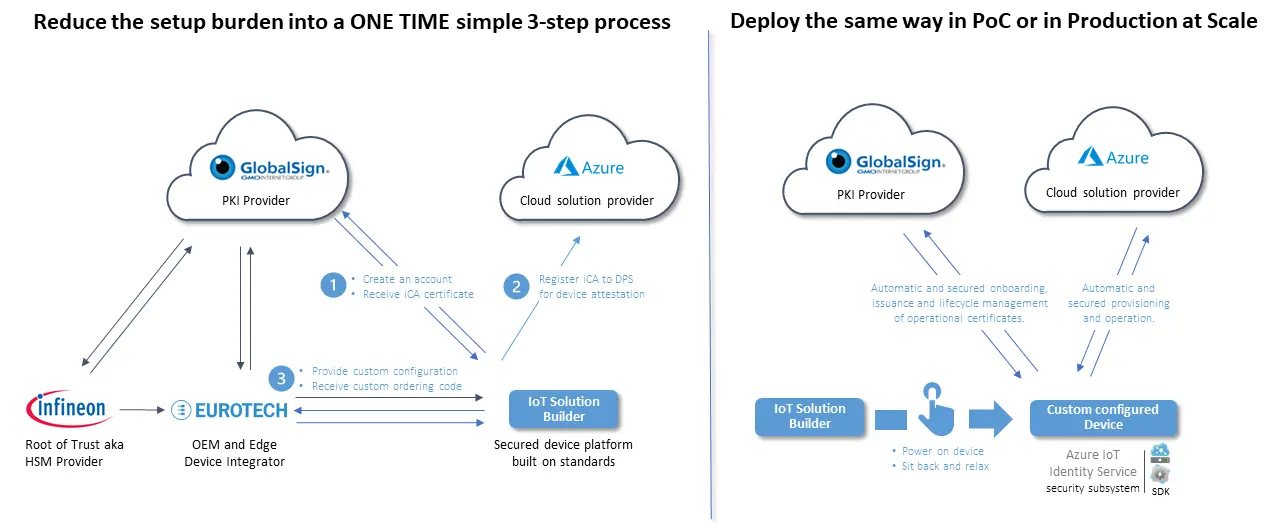 Infineon、GlobalSign、Eurotech和Microsoft Azure已经合作消除了物联网安全的这些障碍。我们为云解决方案提供了一个安全、零接触的物联网设备供应,该解决方案可大规模运行,并降低了供应链受损的风险。